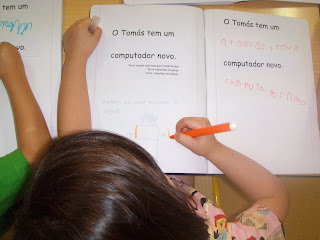 Fizemos o nosso primeiro trabalho de texto no Computador. Todos puderam votar no texto que mais gostavam. O texto do Tomás foi o escolhido. Em pequeno grupo trabalhámo-lo em pessoa: Passámos o texto da primeira (eu) para a terceira pessoa do singular (ele). O Tomás e o Diogo passaram o texto no computador. Depois no caderno organizámo-lo por unidades, de forma a fazer sentido. Estão todos de parabéns porque o trabalho ficou fantástico!!!