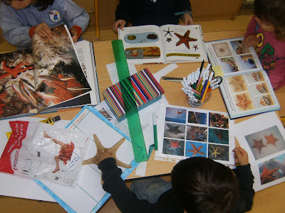 Estamos em fase de desenvolvimento do projecto das estrelas-do-mar. Já fizemos algumas descobertas e estamos a adorar cada livro que folheamos... (obrigada pelos empréstimos que chegaram aí de casa). O entusiasmo é tanto que têm surgido ilustrações fantásticas. Notam-se imensas evoluções. Estou ansiosa que acabemos o projecto para, finalmente, o expor na nossa sala - só assim vão poder ver como está fantástico! Esta fase de pesquisa e produção é das fases mais interessantes de um projecto. Aqui surgem tantas descobertas e questões que muitas vezes acabam por desencadear outros novos projectos.
