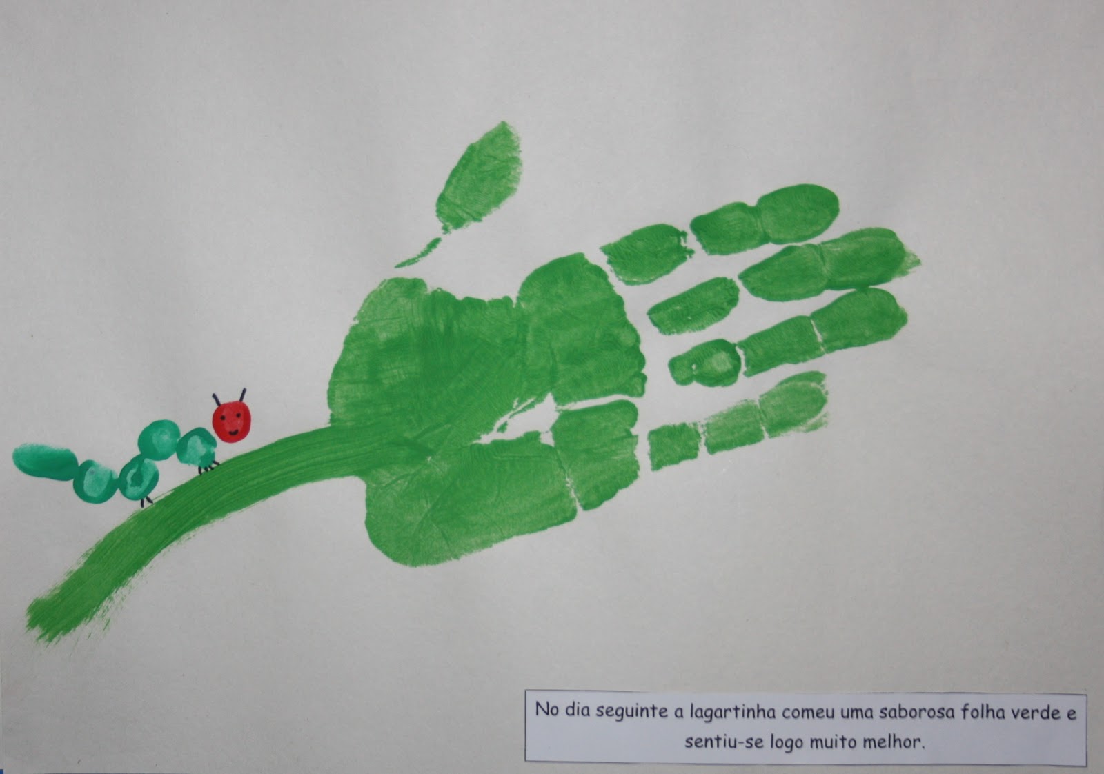 Com mãos, dedos, tintas, recortes e colagens reproduzimos a história da Lagartinha Comilona de Eric Carle.
