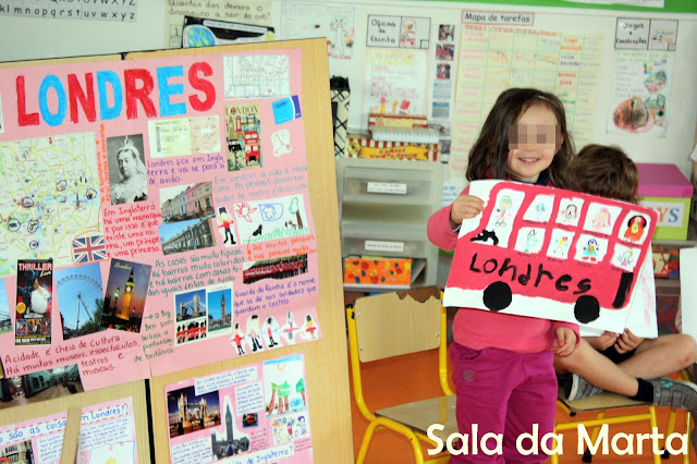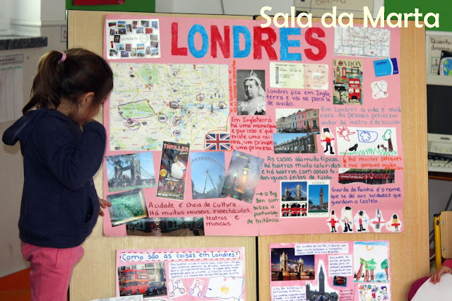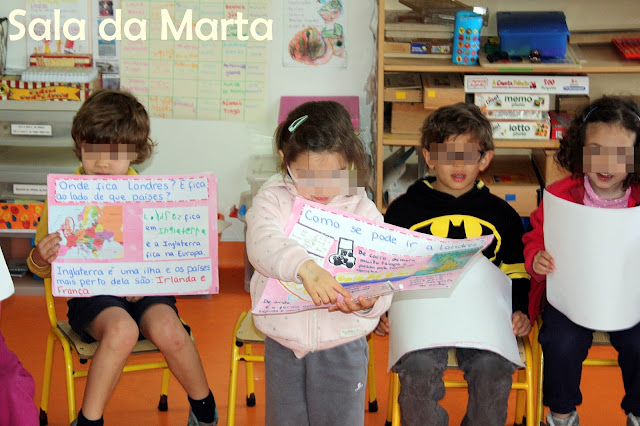 Há um tempo atrás, numa reunião da manhã, a Matilde e a Madalena A. traziam notícias parecidas: A mãe da Madalena ia para Londres em trabalho e o Pai da Matilde estava em Londres a trabalhar. As perguntas começaram a surgir. Que sítio é esse? O que se faz lá? A Sofia já tinha visitado Londres, o ano passado, nas férias. Os pais do Afonso também já lá tinham estado num fim-de-semana em que ele ficou em casa da Matilde. Londres passou a estar na ordem do dia! Todos queriam saber coisas sobre Londres. Mandámos um email aos pais que estavam pela cidade, para nos trazerem toda a informação que pudessem. Impossível descrever em palavras tudo o que recebemos... seguem-se imagens. Imagens do material que recebemos, do cartaz que fizemos, do projeto que concluímos, com imensas perguntas respondidas. Hoje foi dia de comunicação. Que orgulho ver este grupo partilhar, desta forma, com as salas da Marta e do Álvaro, tudo o que aprenderam.