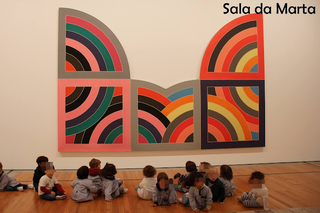 Chegámos ao Museu e entrámos. Os primeiros "UAU's" surgiram em cânone. Era um deslumbre com cada uma das obras que observávamos. Era o rodopiar à frente de cada quadro e a felicidade imensa de quem se vê envolvido em tamanha expressão artística. De quadro em quadro fomos nos apaixonando mais por este museu. Nalguns parámos e observámos apenas. Noutros sentámo-nos e desenhámos no chão aquilo que aquela tela nos inspirava. Algumas obras inspiraram-nos a dançar e outras houve que nos impeliram a encontrar significados: "Será um cavalo?"; "Ali está uma mesa!" Descobrimos cores, pessoas, formatos, formas, traços, bolas, linhas, objetos... descobrimos a Arte e foi tão bom!