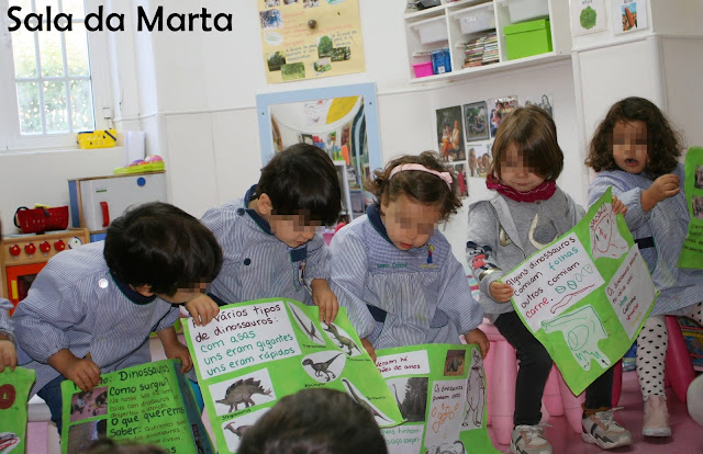 Na nossa sala existem caixas com vários brinquedos, materiais e possibilidades de descoberta. No início do ano começámos a explorar cada uma das áreas da nossa sala, mas não foi logo que se descobriu tudo o que por lá existia. Ora, há umas semanas a caixa dos dinossauros foi descoberta. As brincadeiras intensificaram-se à volta destes animais e a curiosidade foi mais além.