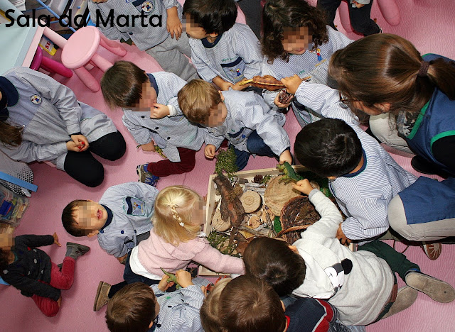 A nossa caixa de dinossauros estava um encanto e proporcionava agora ainda mais brincadeiras. Decidimos, então, ir ao parque em frente à escola, apanhar mais elementos da natureza para enriquecer o nosso novo espaço de brincadeiras.