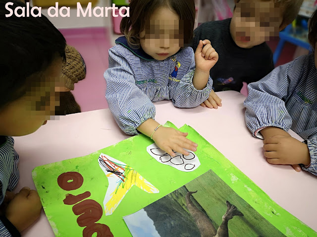 Regressámos à sala e começou uma intensa produção cultural à volta do tema dos dinossauros. Surgiram desenhos à vista, pinturas, "escrita" sobre os dinossauros... uma verdadeira maravilha que fomos acompanhando com o registo das nossas descobertas.