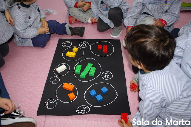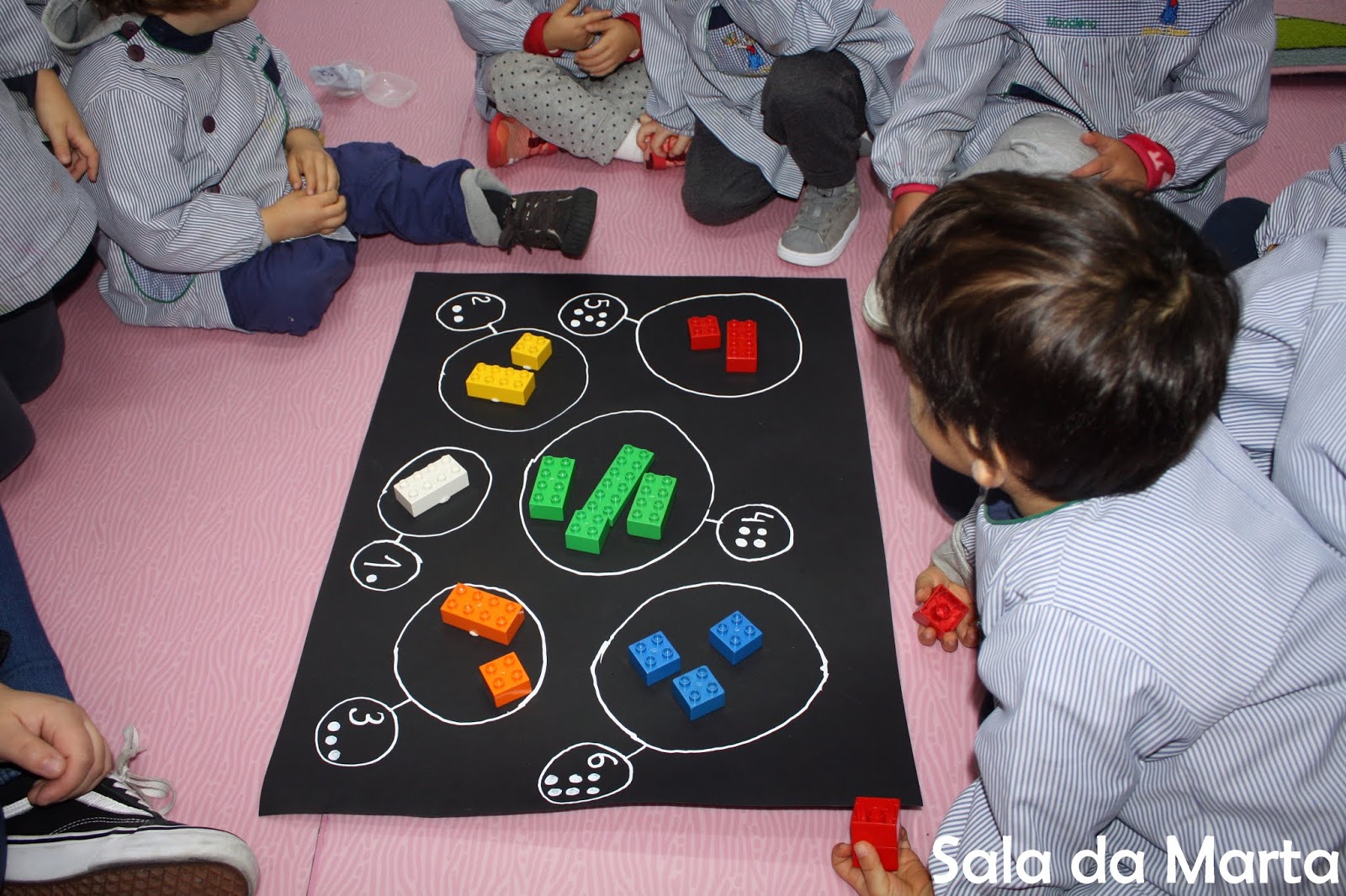 Depois de juntarmos as peças por cores e percebermos que todas tinham número diferente, a Patrícia sugeriu agruparmos as peças. Foi assim que surgiu, com muita brincadeira e diálogo à mistura, o conceito de conjunto.
